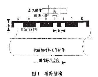 采用圖1所示的測量結(jié)構(gòu),其中被測工作部件要求屬于鐵磁性材料。文獻中指出在固定的磁場中,表面變化的曲率越大,引起的周圍磁場,變化也越大。為了使磁場的影響最大,選用凹槽作為測罩標志,以單位寬度(bmm)的凹槽表示“0”或碼元間隔,單能寬度的“凸槽”表示“1”,兩倍單位寬度的“凸槽”表示標志位R。在工作部件表面,按上述的編碼規(guī)則加下出一系列凹槽,然后噴涂上非磁性材料,形成磁性標尺。圖1所示的磁性標尺表示Gray碼01 1010碼區(qū),黑色部分表示非磁性材料。