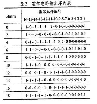 霍爾電路的工作原理是,在外磁場的作用下,當磁感應(yīng)強度B超過導(dǎo)通工作點時,霍爾電路輸出管導(dǎo)通,輸出低電-半:若曰值低于釋放點時,輸出管截止,輸出高電半。因此在“凸槽”時鋼質(zhì)活塞桿被磁化,磁感應(yīng)強度曰增加,霍爾電路導(dǎo)通,輸出低電平,用“1”表示;在“凹槽”時輸出高電平,用“0”表示。以第1個霍爾元件為測量基準,從圖2所示時刻起,位移暈旃次變化b=2mm時,一個碼區(qū)行程內(nèi)霍爾電路輸出的二進制序列如表2所示。分析可知,序列的標識碼為l 0000000 1,其前面或后面6位序列數(shù)分別為相鄰的兩個數(shù)值碼,這使它具有很強的容錯能力。標識碼每隔一個霍爾元件間距N在低位部分右移一位。值得注意的是,標識碼前面的數(shù)值碼代表磁性標尺當前檢測位置下一個碼區(qū)的值。