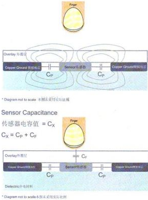 那么,電容式感應(yīng)的工作原埋是什么呢?下面的示意圖顯示了1個電容式感應(yīng)按鈕的橫截面。如圖所示,在外覆層材料之下,存在導(dǎo)電的銅塊區(qū)域和導(dǎo)電的傳感器。在2個導(dǎo)電元件相互之間靠得很近時,就會產(chǎn)生一個電容值,本圖中標(biāo)為Cp,這個電容值是由于傳感器墊板與接地板之間的耦合現(xiàn)象而形成的。Cp屬于寄生電容,典型數(shù)量級任10pF至300pF。傳感器與接地板靠近時也會形成一個邊緣電場,這個電場能夠穿透外覆層?;旧希梭w組織也屬于導(dǎo)電體。將一根手指放存邊緣電場附近時,就會增加這個電容系統(tǒng)的導(dǎo)電表面面積。