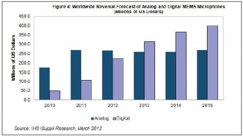 據(jù)IHS公司的MEMS專題報(bào)告,由于具有對(duì)電磁干擾的免疫力較高和設(shè)計(jì)階段具有更大的靈活性等優(yōu)點(diǎn),越來(lái)越多地被用于手機(jī)、筆記本以及蘋果iPad等暢銷產(chǎn)品之中,數(shù)字MEMS麥克風(fēng)的銷售額明年將超過(guò)模擬產(chǎn)品。