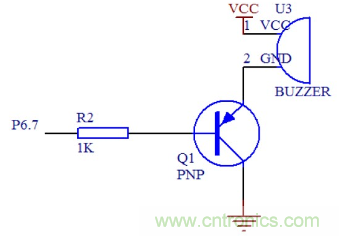 蜂鳴器在微處理器判斷為火災(zāi)時(shí)發(fā)出報(bào)警指示音。由于單片機(jī)的I/O 口驅(qū)動(dòng)能力有限,選用PNP型晶體管2N5401 組成晶體管驅(qū)動(dòng)電路來驅(qū)動(dòng)壓電式蜂鳴器。