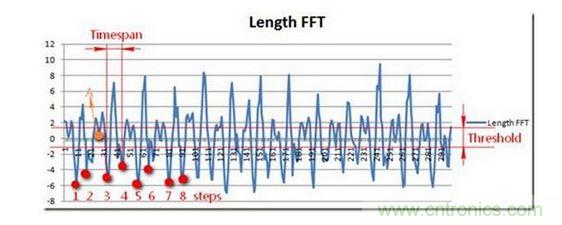 人體最快的跑步頻率為5HZ,也就是說相鄰兩步的時間間隔的至少大于0.2秒,如圖所示,我們設(shè)置了timespan在記步過程中我們過濾了高頻噪聲,即步頻過快的情況。同時我們通過和上次加速度大小進行比較,設(shè)置設(shè)立一定的閥值Threshold來判斷運動是否屬于有效,有效運動才可進行記步。