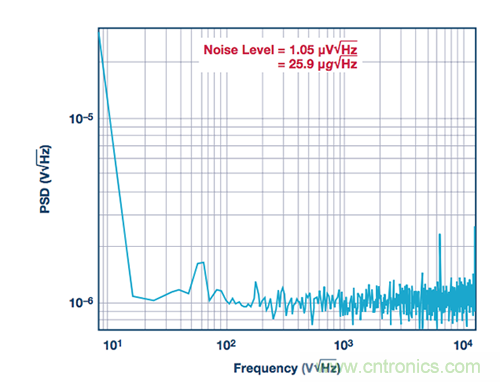 圖2顯示了21 kHz諧振頻率的MEMS加速度計(jì)和25 kHz諧振頻率的PZT傳感器的頻譜測(cè)量結(jié)果。MEMS加速度計(jì)在1 Hz至1 kHz頻段中的均方根(rms)輸出要比PZT加速度計(jì)高出大約30 mg或1.7%。