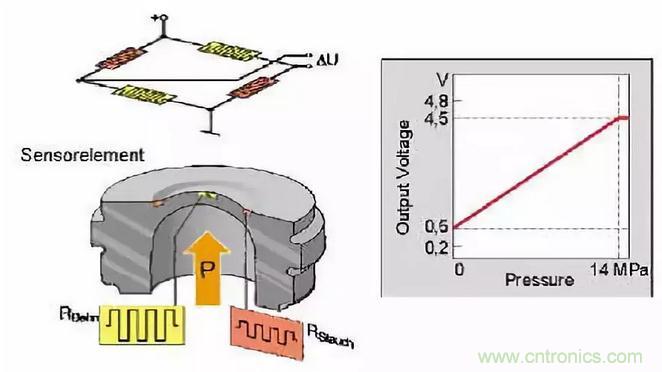 的惠斯頓電橋,膜片的變形導(dǎo)致應(yīng)變計電阻變化,通過外圍電路的的信號處理后,形成與壓力成線